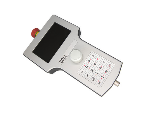 Bedien- und Anzeigefeld, 16 größtenteils programmierbare Tasten, Not-Halt-Taste, DigiPoti, Touch Display im Gehäuse und M12-Anschluss